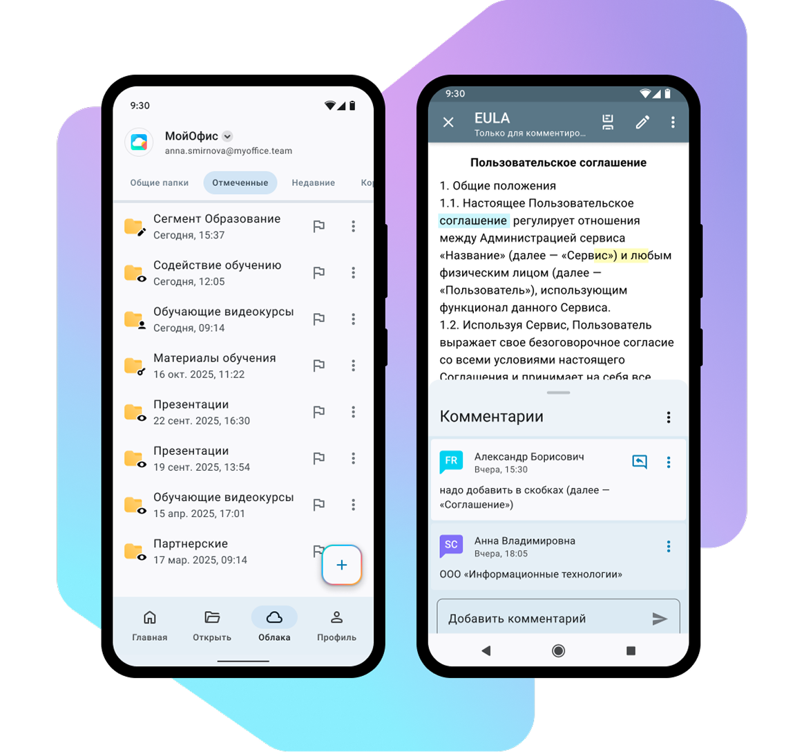 Мобильное приложение для работы с корпоративным хранилищем и возможностями коллаборации. Доступ к документам хранилища с мобильного устройства, совместная работа и редактирование документов, комментирование и рецензирование, управление файлами и доступами в режиме реального времени.