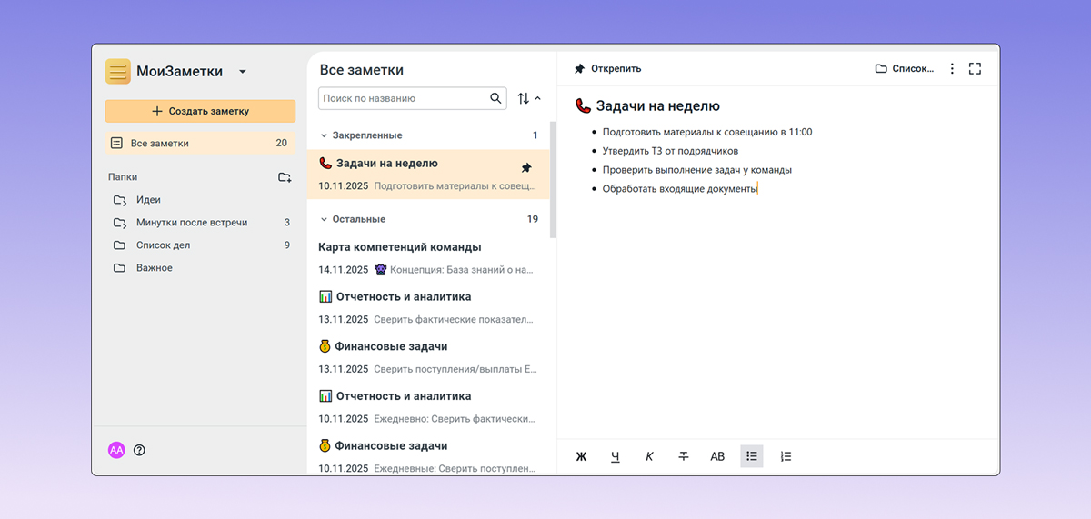 Для удобной организации заметок мы предусмотрели систему папок: вы можете создавать тематические разделы, вложенные папки и перемещать между ними заметки. Чтобы найти нужную информацию, используйте поиск по названию заметок и сортировку по дате создания. Важные записи можно закреплять для быстрого доступа.