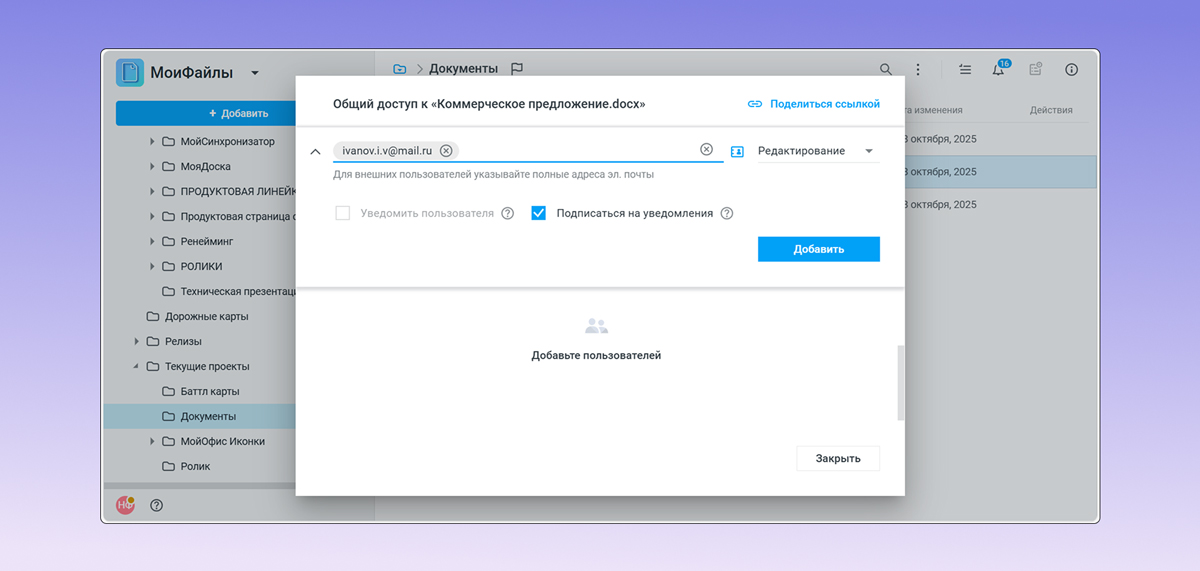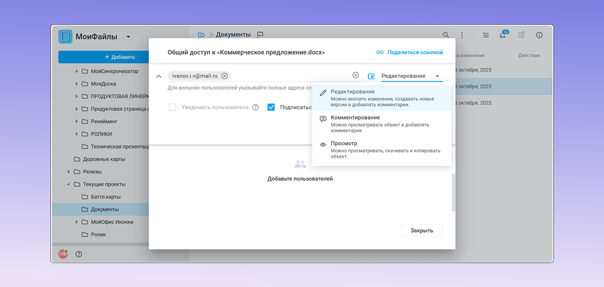 Внешние пользователи с ролью «Гость» получают доступ только к тем документам, которыми вы с ними поделились. Они могут просматривать, редактировать, комментировать, пересылать эти файлы, при этом права таких пользователей в системе ограничены. Так, вы можете пригласить внешнего юриста для правки договора или предоставить дизайнеру-фрилансеру доступ к папке с макетами — и быть уверенными в том, что остальная информация защищена.