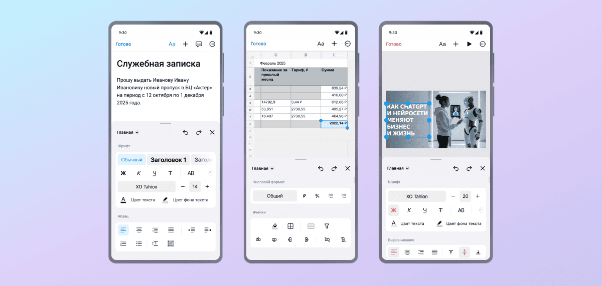 Благодаря простому интерфейсу и широкому набору инструментов в приложении удобно создавать и редактировать текстовые и табличные документы, а также презентации.