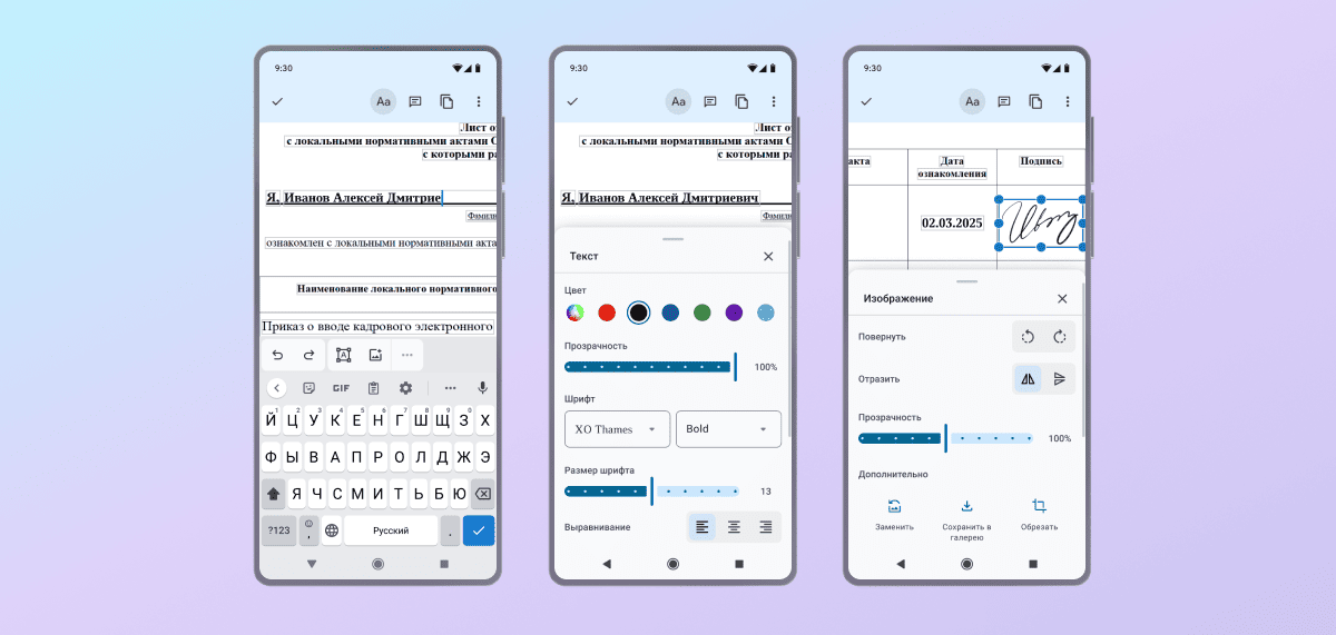 Отдельно отметим возможность работать с документами в формате PDF. Можно заполнять текстовые поля, менять настройки шрифта, добавлять изображения, а еще — работать со страницами: менять порядок, объединять, удалять. Пока редактирование PDF-документов доступно только на Android, скоро эта опция появится и на других платформах.