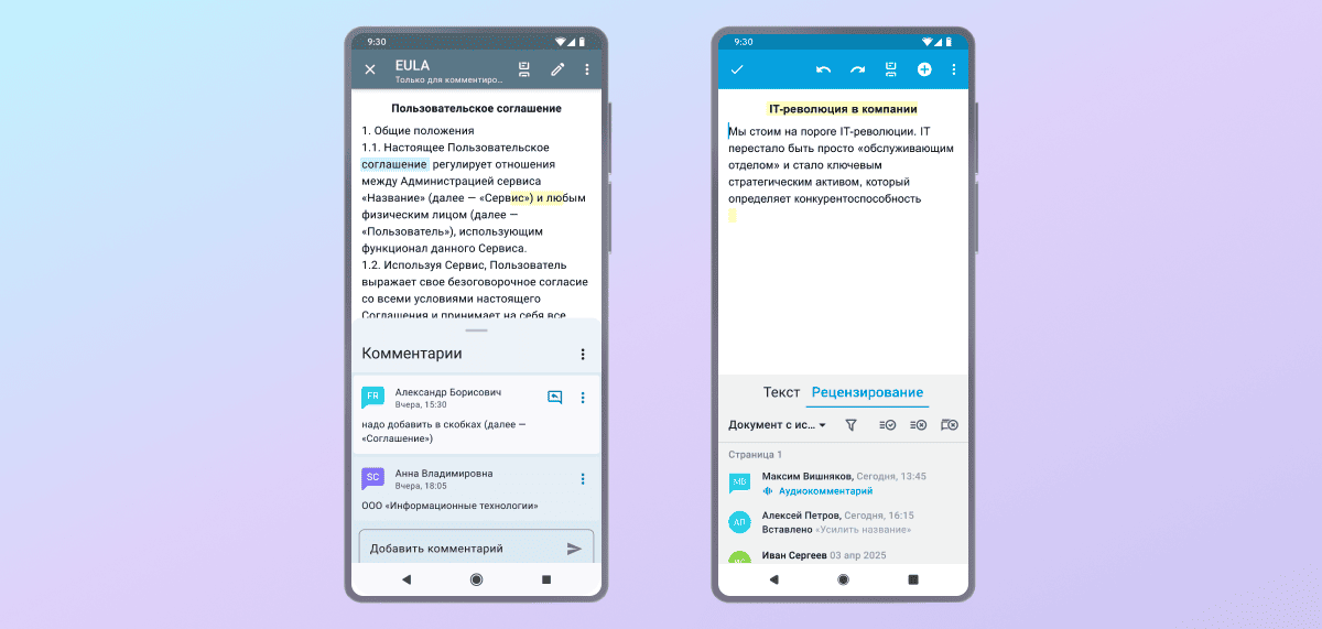 Приложение помогает сделать бизнес-процессы непрерывными. Вы можете продуктивно работать в документах, когда компьютера нет под рукой, — например, по пути на встречу или в командировке. Можно создавать и редактировать документы на смартфоне или планшете без доступа к интернету, записывать голосовые комментарии буквально на ходу.