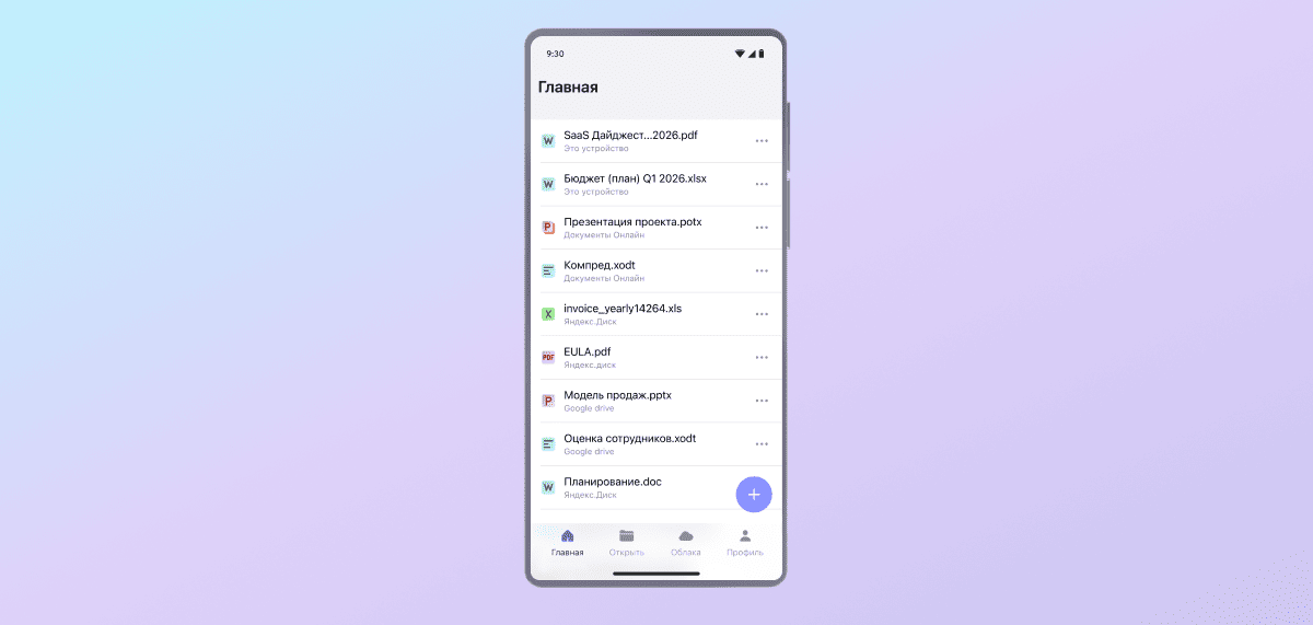 Вам не придется беспокоиться о том, что нужный документ не откроется. Приложение корректно работает со многими популярными форматами файлов, в том числе устаревшими .doc и .xls. Вот полный список: .docx, .doc, .xlsx, .xls, .pptx, .odt, .xodt, .xlsx, .csv, .ods, .pdf, .rtf, .txt, .xml.