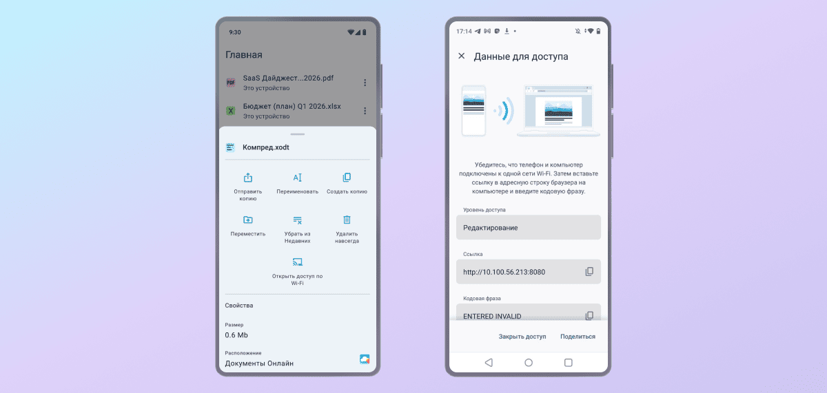 С помощью функции AirEdit вы можете открыть документ с мобильного устройства на компьютере и внести правки там. Смартфон становится мини-сервером: документ остается на устройстве, а десктопный редактор открывается в браузере компьютера. Изменения автоматически сохраняются в файле на смартфоне.