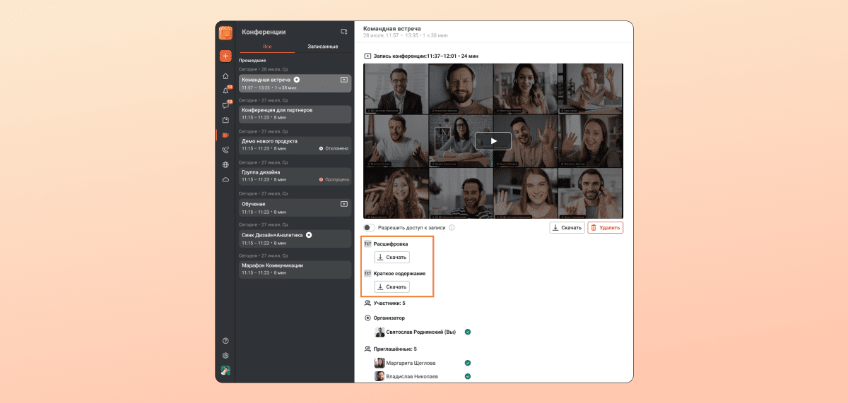 Чтобы получить расшифровку или итоги видеоконференции, достаточно нажать одну кнопку