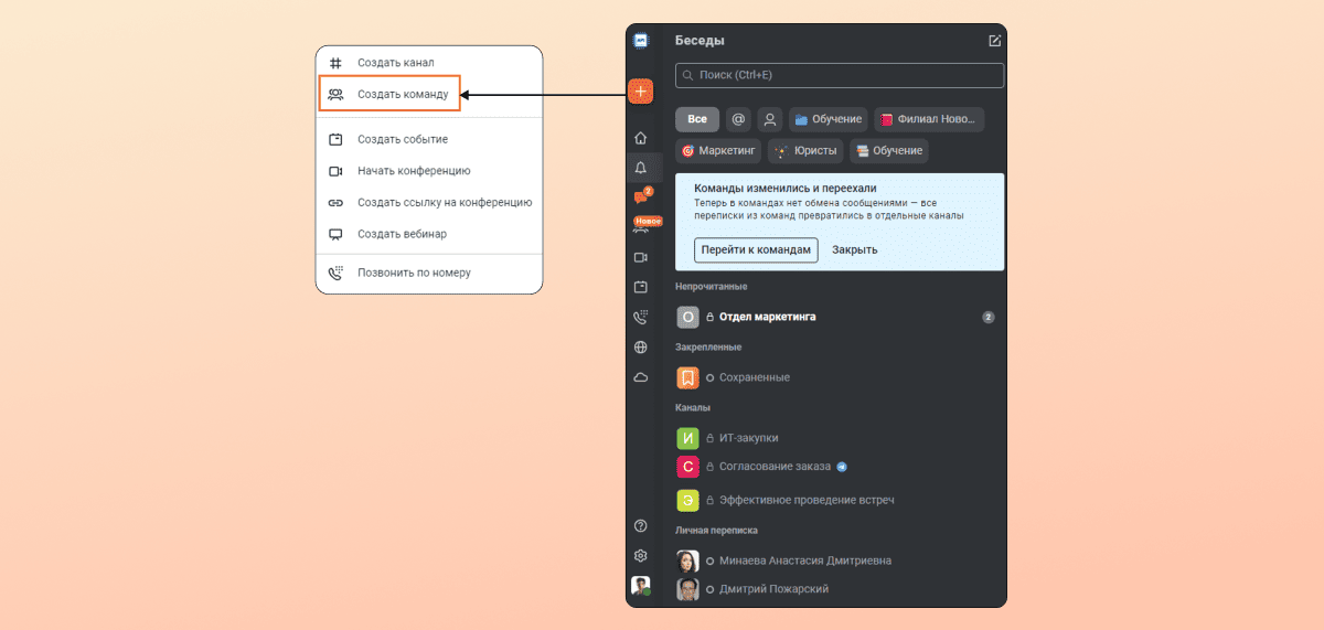 Теперь команды — это не чаты, а полноценные цифровые рабочие пространства для коллективов. В них вы можете гибко управлять пользователями, каналами и проектами.