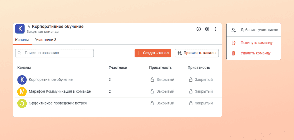 Слева — поиск по каналам в закрытой команде. Справа — действия, доступные владельцу и модератору команды