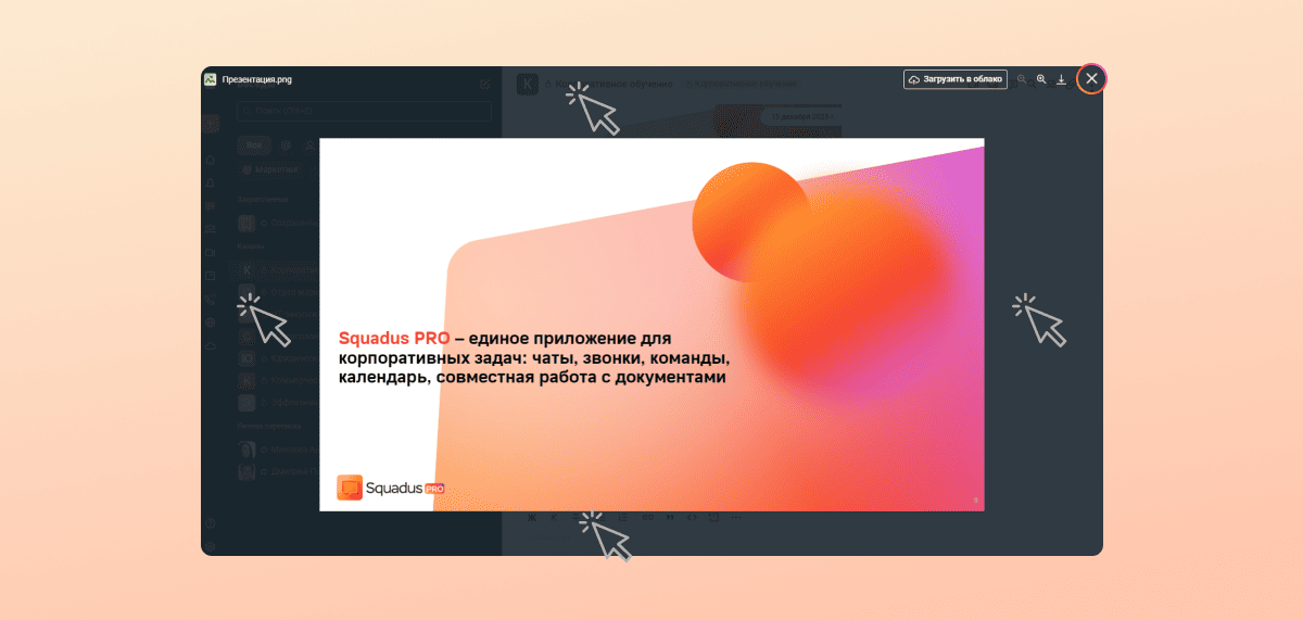 В окне Squadus PRO — тот же интерфейс, что и в приложении «МояДоска», пользователи видят, кто правит и просматривает файл