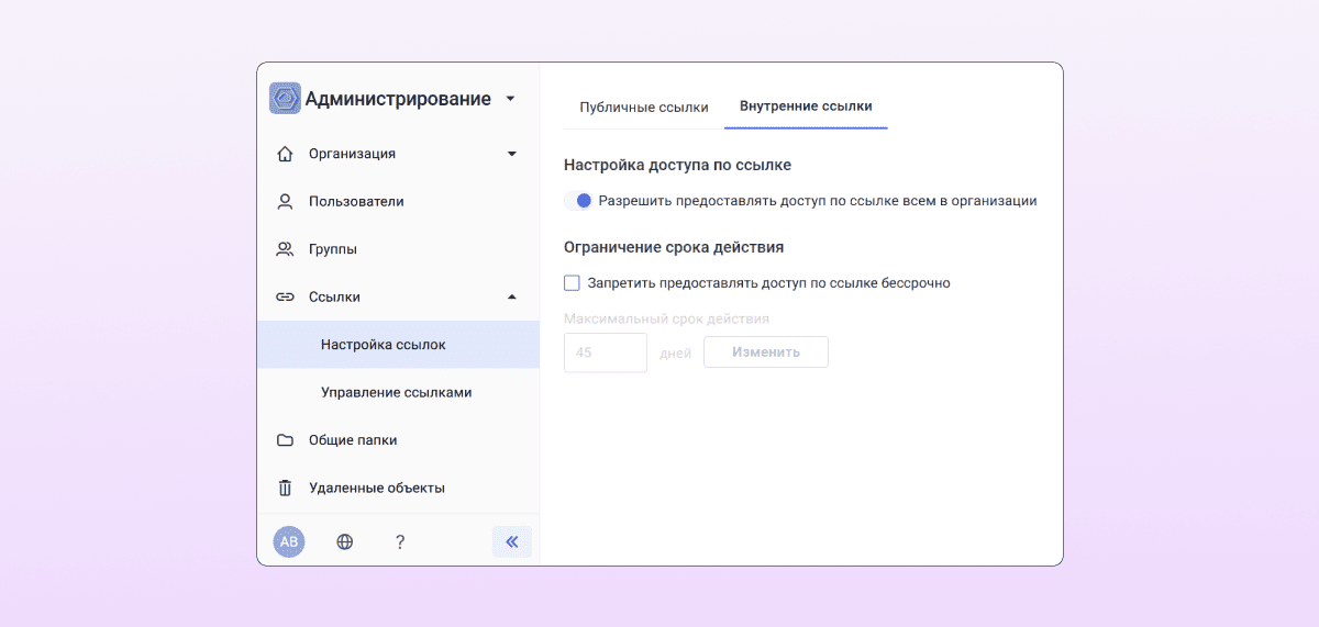 Благодаря новой возможности все авторизованные в системе сотрудники могут получить доступ к текстовому документу, таблице, презентации или виртуальной доске моментально. Чтобы функция стала доступна пользователям, администратору системы нужно поменять настройки в разделе «Настройка ссылок».